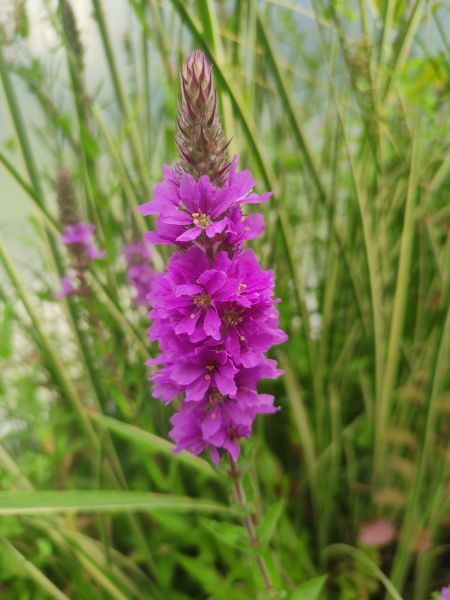 Krwawnica pospolita (Lytthrum salicaria) Odporna i długo kwitnąca roślina o purpurowych kwiatach. To jewst rodzimy polski gatunek. Bardzo łatwa uprawa, rośliny te się chętnie same rozsiewają. Osiąga wysokość około 120 cm. Preferuje podłoże kwaśne. Może rosnąć także na rabacie jeśli jest zapewnimy wilgoć. Zakwita latem. Zbliżenie kwiatów na fotografii poniżej. Na zimę uschnięte kwiatostany się usuwa, wiosną wyrastają nowe z kłącza.