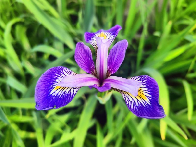 Iris virginica. Bardzo ładnie wybarwione fioletowe kwiaty. Co ciekawe wiosną fioletowe są także liście co daje bardzo interesujący akcent. Później liście stopniowo zielenieją, dłużej pozostaje fioletowy pęd kwiatowy.